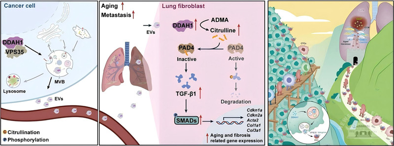 The team identified, through comprehensive proteomic analysis of tumor sEVs and single-cell sequencing of lung tissues, that DDAH1 carried by these vesicles induces fibroblast aging in the lungs.